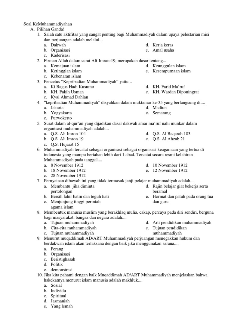 Contoh Soal Kemuhammadiyahan Dan Jawabannya - Revisi Sekolah Mar 22 2020 Contoh soal kemuhammadiyahan dan jawabannya. Pimpinan daerah muhammadiyah. Berilah tanda silang X pada huruf A B C atau D pada jawaban yang benar.